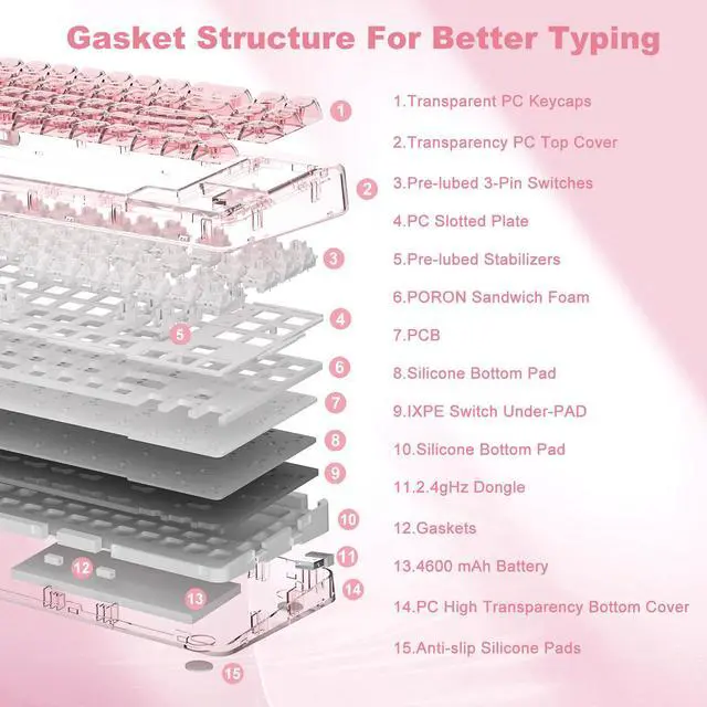 The YUNZII Custom Keyboard utilizes a high-quality gasket material and silicone pad to absorb vibrations and eliminate any noise. Equipped with Poron sandwich foam, Poron socket foam, and PET sound pads, the X71 gasket-mounted mechanical keyboard provides you with a quieter and smoother typing experience for a unique typing feel.