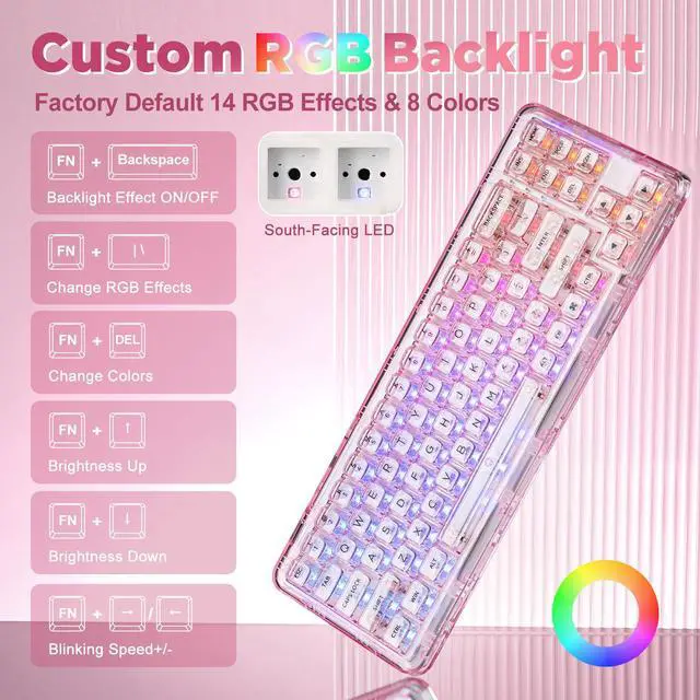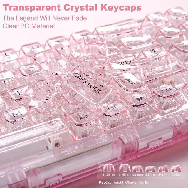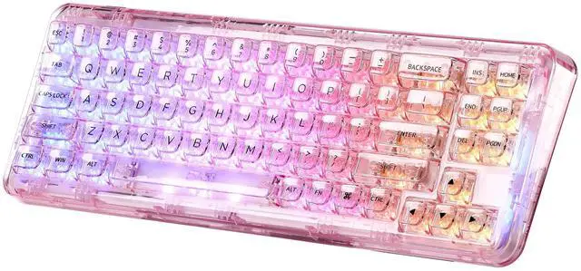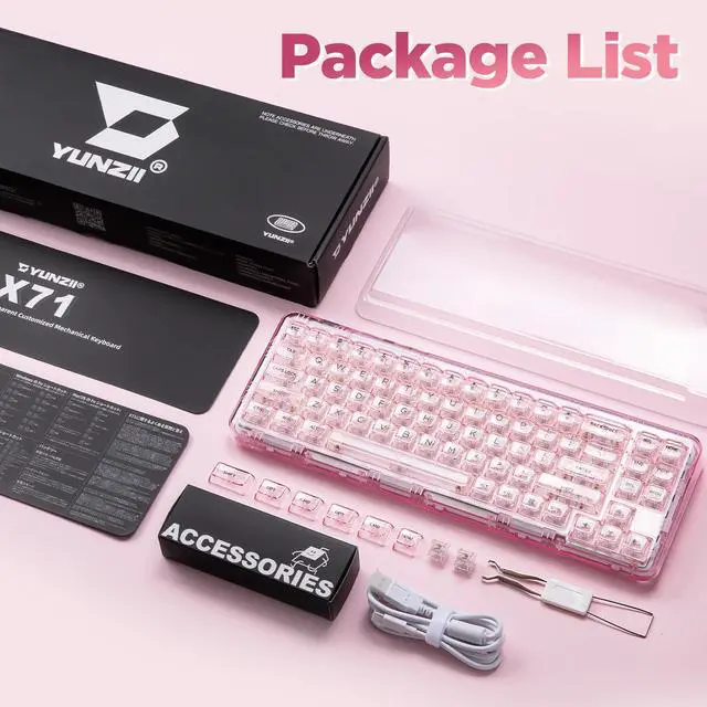 YUNZII X71 gaming keyboard Crafted from high-transparency PC material, the casing and shine-through keycaps maintain purity and clarity. Double-layer clear keycaps not only preserve the crystal aesthetic appeal but also ensure keycap characters remain anti-fade. The PC gaming keyboard with south-facing LEDs has 14 factory-set lights and music rhythm modes. Programmable software is available for RGB customization and key remapping.