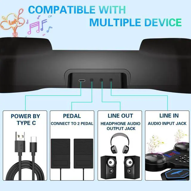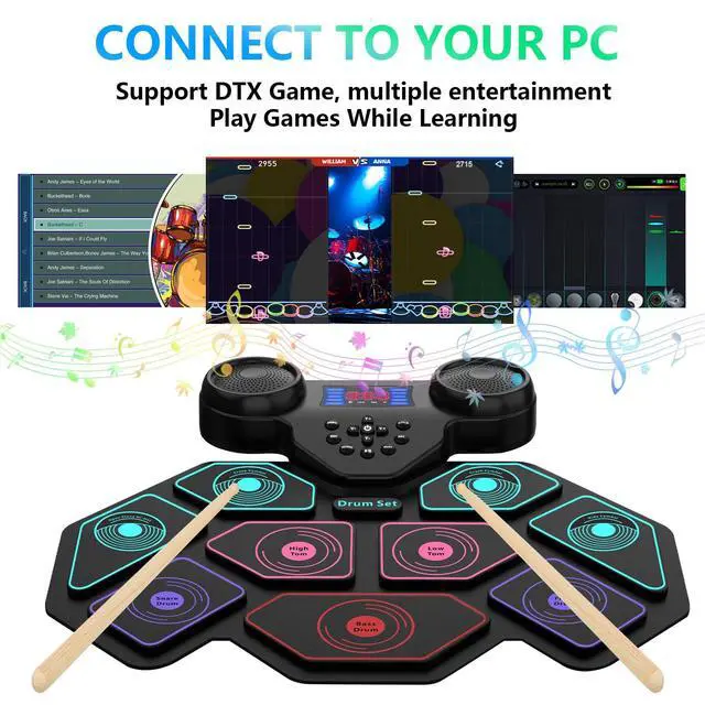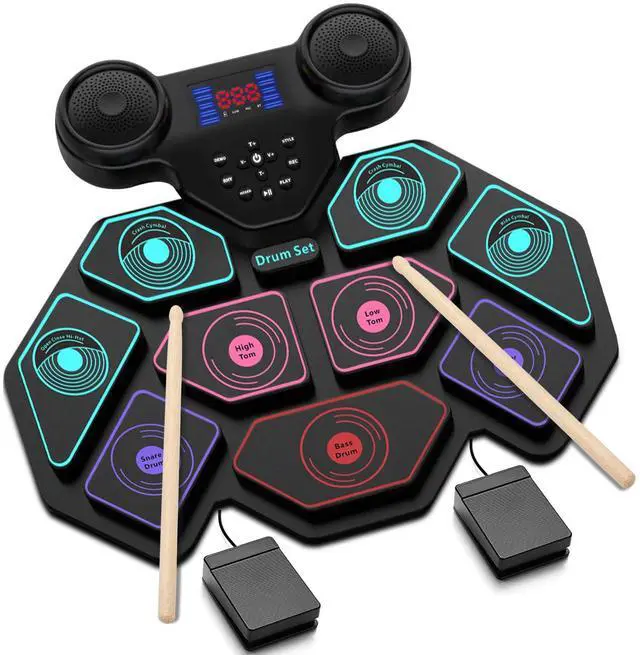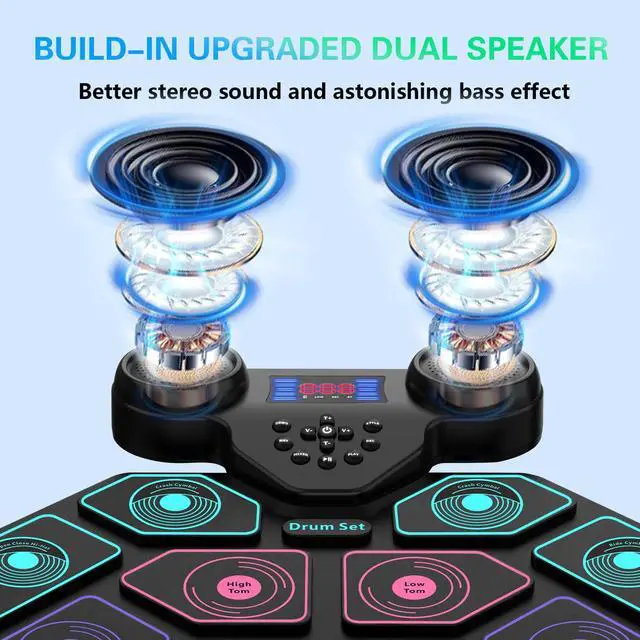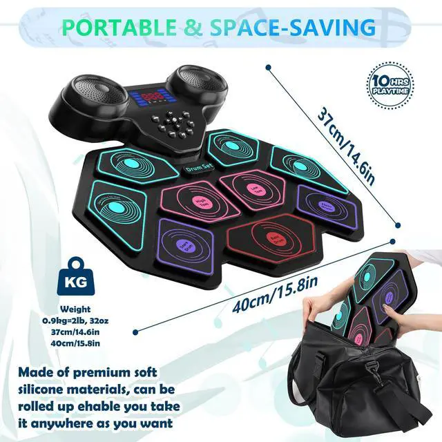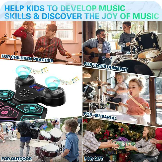 This electric drum pad is powered by a 1200mAh rechargeable battery, up to 10 hours playtime per charge, with roll-up and potable design, you can enjoy electronic music life with your kids indoors or outdoors such as party, camping or on the go travel.