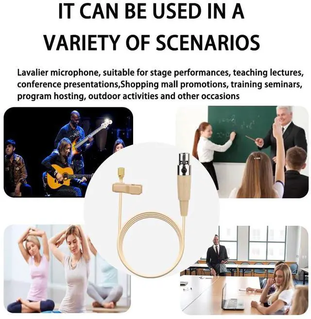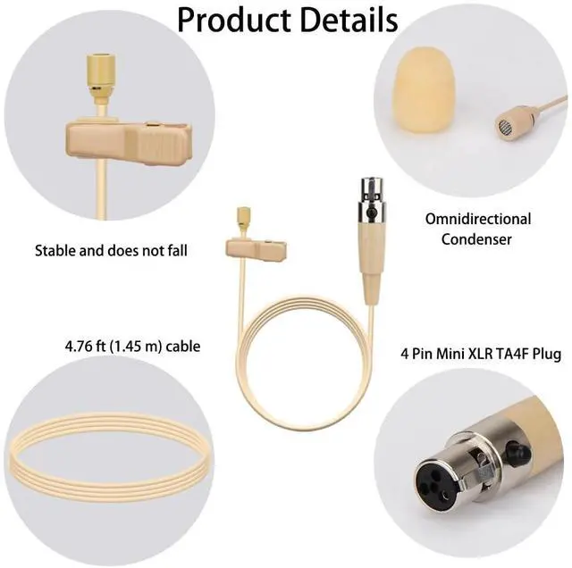 with 1.45 meter (4.92 feet) cable, mini XLR 4-pin TA4F plug connector, compatible with the following devices Shure 11, LX1, L1,SC1, U1, UC1, ULX1, UT1, T1, UR1, PG1 and KCX, Performance Gear, PGX, FP, BLX, SLX, GLX, GLX-D, ULX, QLX, QLX-D, ULXD, UHF-R (note: only compatible with Shure!!! Other brands may not work as internal wiring may be different. This is a capacitive microphone that requires power from the wireless system. Please ensure that your device will power the microphone.)