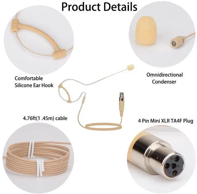 with 1.45 meter (4.92 feet) cable, mini XLR 4-pin TA4F plug connector, compatible with the following devices Shure 11, LX1, L1,SC1, U1, UC1, ULX1, UT1, T1, UR1, PG1 and KCX, Performance Gear, PGX, FP, BLX, SLX, GLX, GLX-D, ULX, QLX, QLX-D, ULXD, UHF-R (note: only compatible with Shure!!! Other brands may not work as internal wiring may be different. This is a capacitive microphone that requires power from the wireless system. Please ensure that your device will power the microphone.)