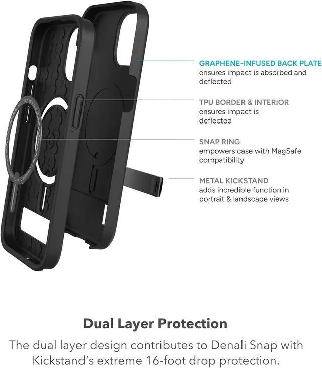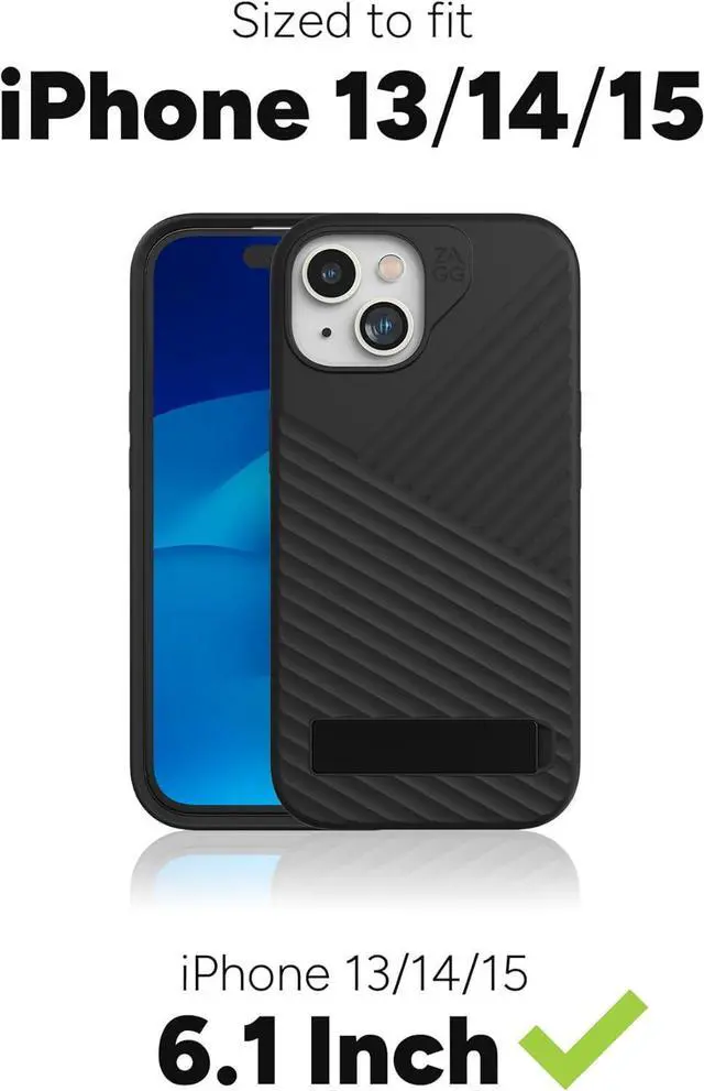 TOUGH PHONE CASE WITH KICKSTAND - Made of durable Graphene material, the ZAGG Denali Snap Case for iPhone 15 is an extremely protective phone case with drop resistance of up to 16 feet (5m). Features an integrated kickstand for hands-free viewing