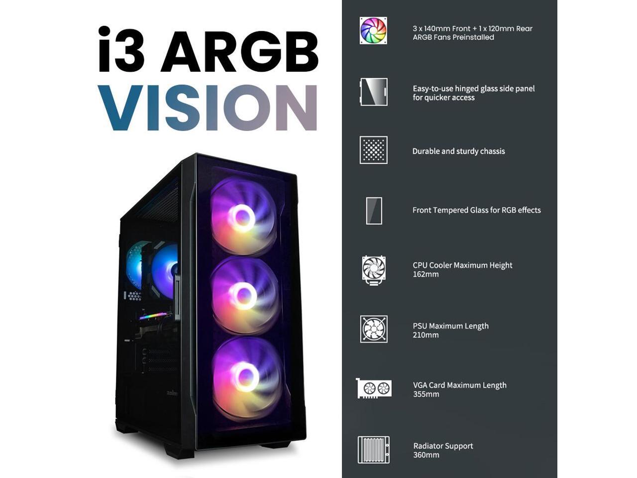[I3 Neo TG Case] Hinged tempered glass side panel with 1 x 120mm Rear ARGB Fan + 3 x 140mm ARGB Fans Pre-installed, 360 Rad front mount compatible, 2 x USB 3.0, USB 2.0 Power & Reset Buttons