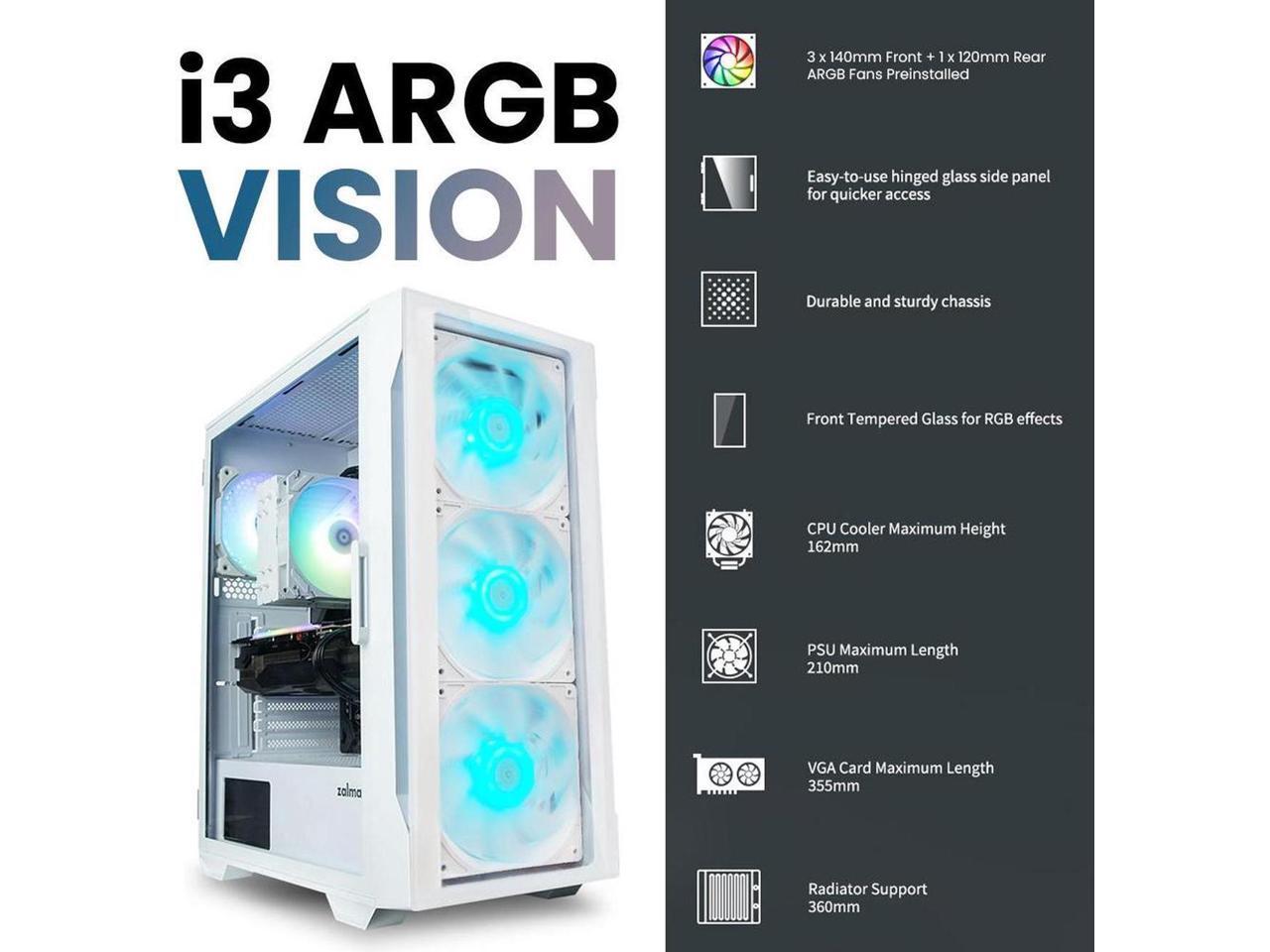 Zalman Case Cooler PSU Combo - Zalman i3 Neo TG 140 Vision White ATX Mid-Tower PC Case + 9X Performa Plus White 180W TDP CPU Cooler + Gigamax 600W 80+ Plus Bronze PSU
