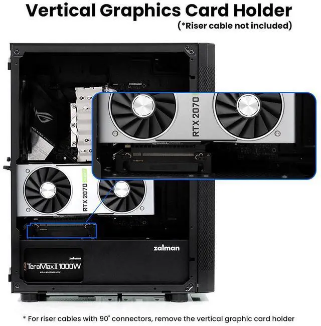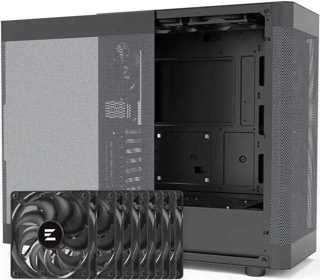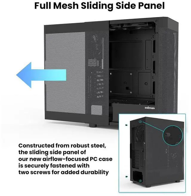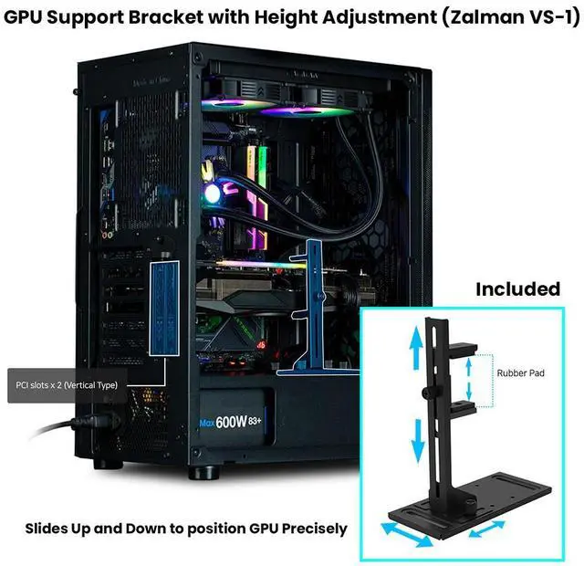 Introducing the Zalman I4 - a game-changer in PC case design. Its full mesh front panel and four 140mm pre-installed rainbow led high airflow fans guarantee superior cooling performance. The adjustable anti-sag GPU support bracket and vertical mount support keep your graphics card secure and stylish. Enjoy tool-less installation and easy access with the top-mounted I/O panel featuring audio-in/out, USB 3.0, and USB 2.0 ports. Upgrade your build with the Zalman I4 for unmatched cooling efficiency and convenience.