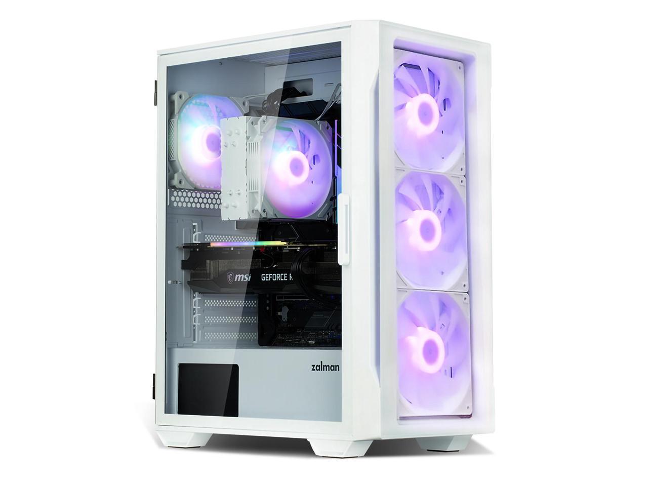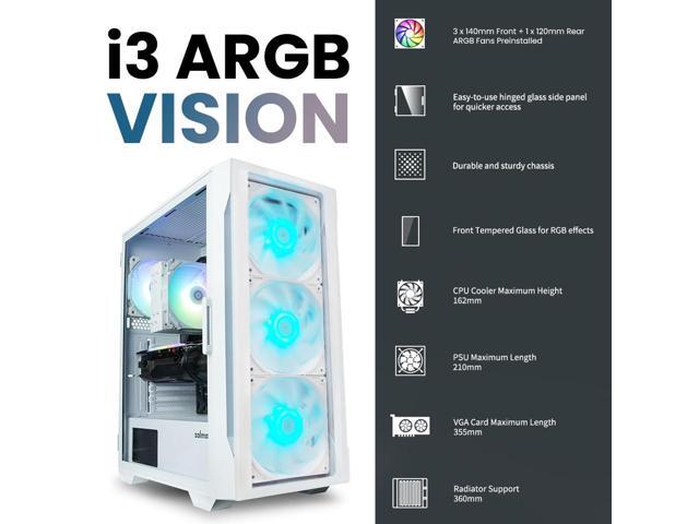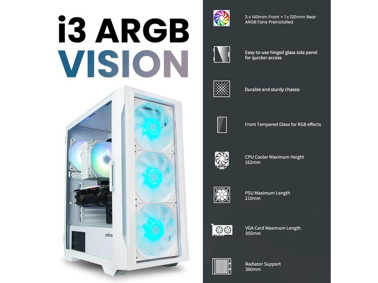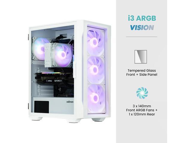 Zalman i3 ARGB Vision-TG ATX Mid-Tower Gaming PC Case, 4 x ARGB Fans Pre-Installed (3 x 140mm + 1 x 120mm rear), Tempered Glass Front & Side Panel, White