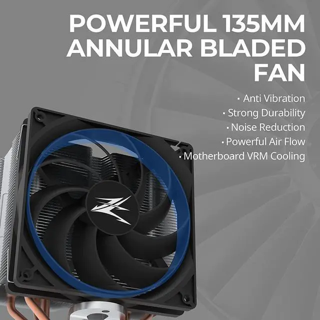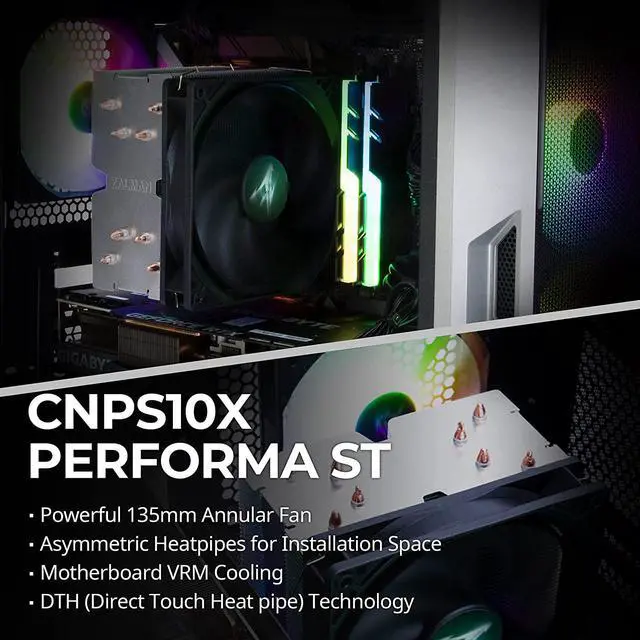 Zalmans CNPS10X Performa Black gives you the flexibility to install another 120 or 135mm fan for added cooling potential. Also incorporated in the Performa are 4 heatpipes, optimized fin profile and heatsink structure for the best performance. Differentiated from typical U-shaped heatpipe coolers, a central band of rippled aluminum fins adds a sleek and cool aesthetic finish with the added black paint. The CNPS10X Performa Black uses PWM fan speed resistor cable and features the latest intel and amd cpu compatibility.