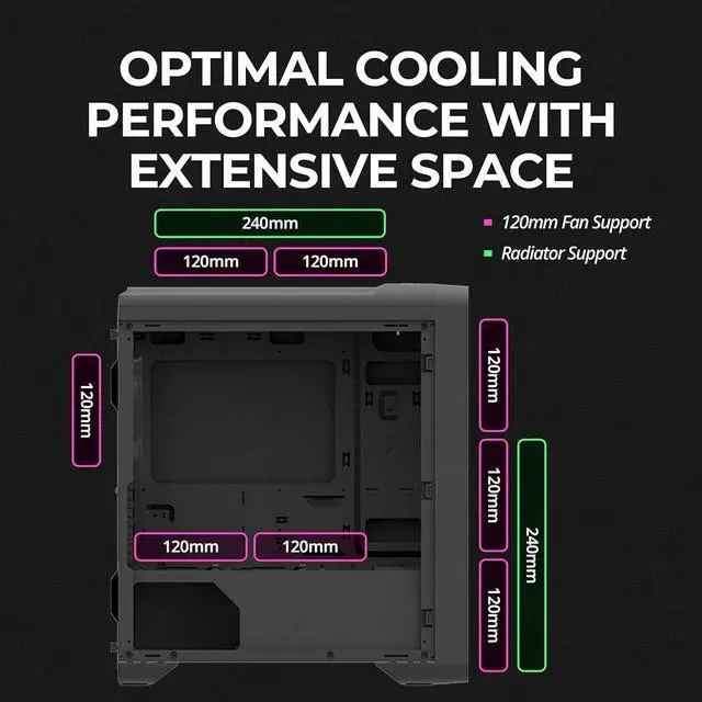 - Supported Fans: Front: 3×120mm/Rear: 1×120mm/Top: 2×120mm/Bottom: 2×120mm