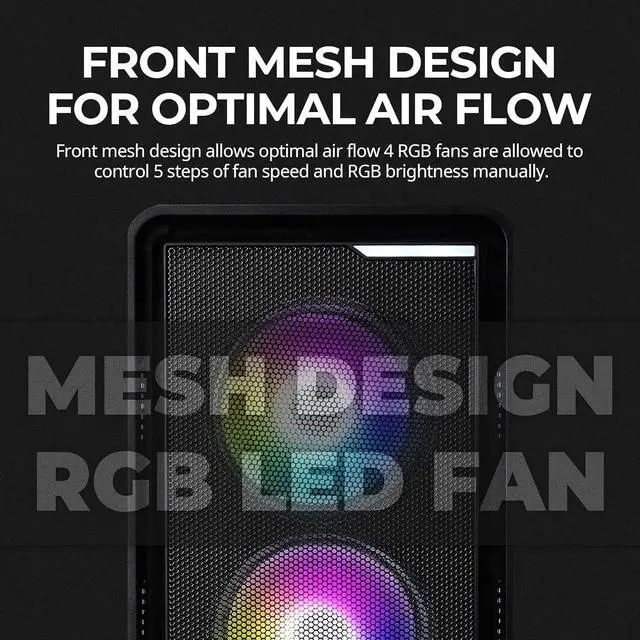 Front mesh design allows optimal air flow 4 RGB fans are allowed to control 5 steps of fan speed and RGB brightness manually.