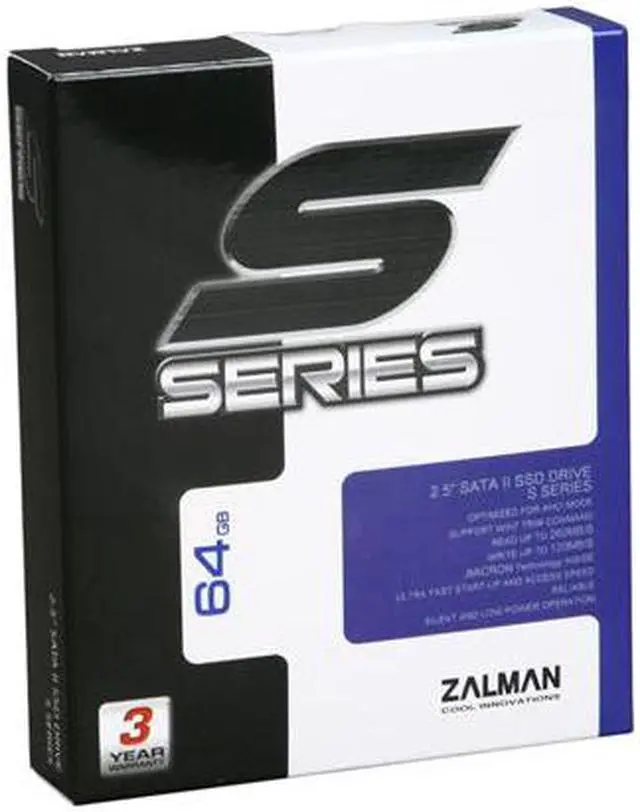 • neweggA Major Upgrade in PerformanceIn addition to its 128MB DDR2 SDRAM, the Zalman S Series utilizes the latest JMicron controller and Intel MLC NAND Flash to stand out among its competitors, providing up to 260 MB/s sequential read speed and up to 120 MB/s write performance (64GB Model).