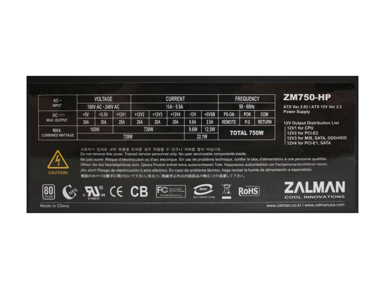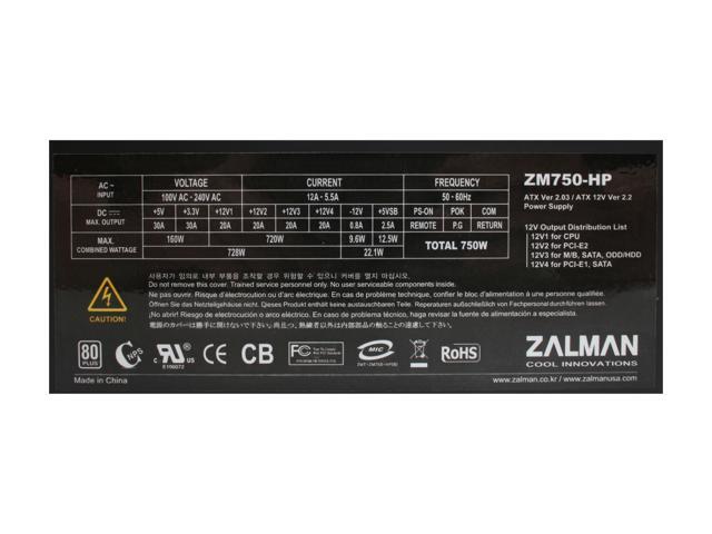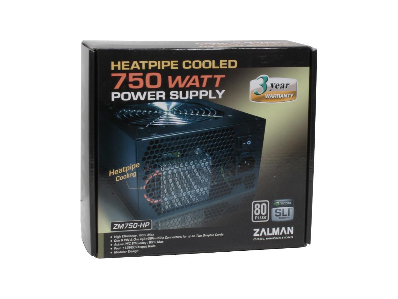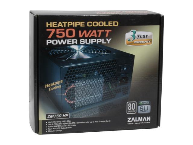 ZALMAN ZM750-HP 750W Continuous @ 45°C (Maximum Continuous Peak: 850W) ATX12V V2.2 / EPS12V V2.91 SLI Certified CrossFire Ready 80 PLUS Certified Modular Active PFC Modular LED Heatpipe-Cooled SLI Power Supply