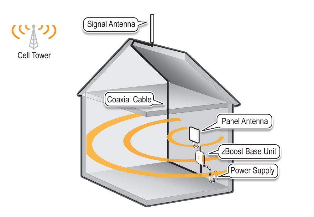 Easy InstallationThe package includes everything you need: base unit, base unit antenna, power supply, coaxial cable RG-6 (50 feet), signal antenna and mounting hardware. The omni-directional signal antenna receives signals from multiple cell towers. FIRST: Mount the Signal Antenna. Choose a location for the Signal Antenna using your cell phone to determine the area of strongest signal. SECOND: Install the Base Unit and Panel Antenna. THIRD: Run the provided coaxial cable between the Base Unit and Signal Antenna. FOURTH: Connect the zBoost Base Unit to the provided power supply and plug into a power outlet.