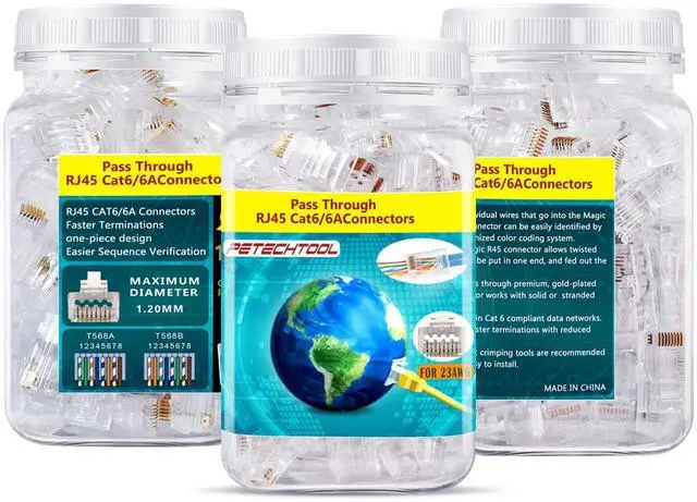 Our RJ45 cat6a cat6 connectors not only let you make enternet cables in custom lenths without breaking the bank , but also work effectively with every model of pass through crimper tool and RJ45 cat6a cat6 connectors for 23AWG cable .