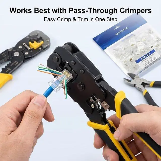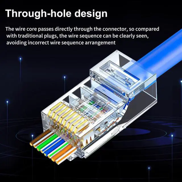 RJ45 Connectors Effortless Pass-Thru Design for Beginners RJ45 Pass Through Connector. Simplify your network cabling with our innovative pass-through design, allowing wires to slide all the way through the connector head. This transparency lets you easily verify the correct wiring order (T568A or T568B) before crimping, significantly reducing scrap rates and saving valuable time for both DIY homeowners and professional technicians.