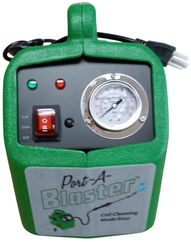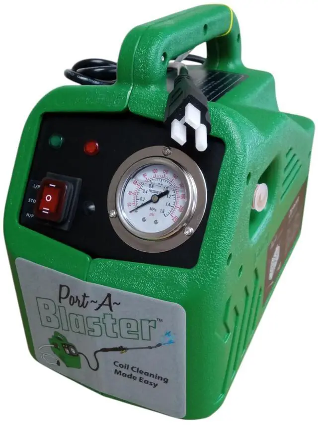The Port-A-Blaster pressure washer is designed to clean air conditioning and refrigeration coils. It is designed with a low pressure setting for oudoor condenser coils. It is lightweight, ruggedly built, reliable, self priming and easy to use and carry. All accessories (trigger sprayer, wand/nozzle and hoses) are convieniently stored in an on-board compartment. The pump cuts off with the pressure control.