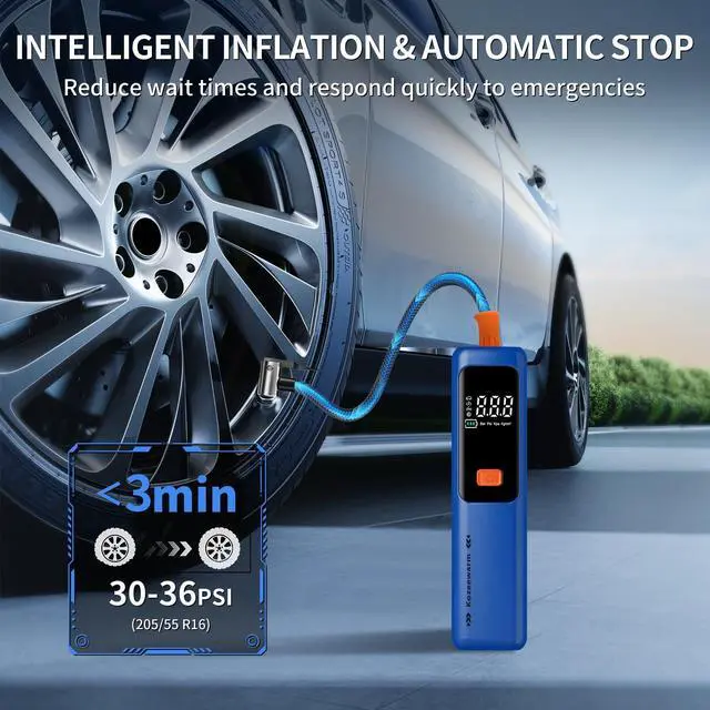 • 3X FASTER INFLATION This portable tire inflator is powered by a high-speed motor and smart performance chip, delivering up to 36PSI and strong airflow. It can inflate a standard car tire from 30 to 36PSI in under 1 minute, offering 3X faster inflation than typical air compressors. Save time during emergencies or daily maintenance.