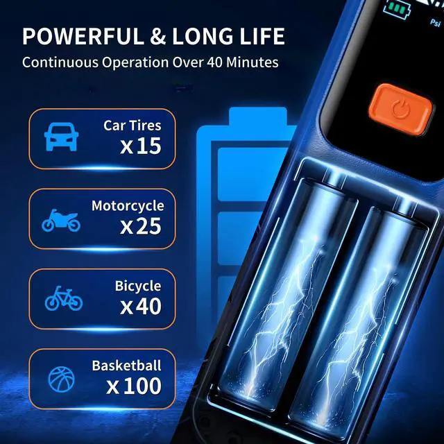 • LONG-LASTING BATTERY LIFE Built with high-capacity rechargeable batteries, this cordless air compressor provides extended operation without frequent charging. On a single charge, it can inflate 2 car tires, 25 bike tires, or 60 balls, Note: For optimal performance and safety, please allow the device to cool down for 10 minutes after 15 minutes of continuous use.