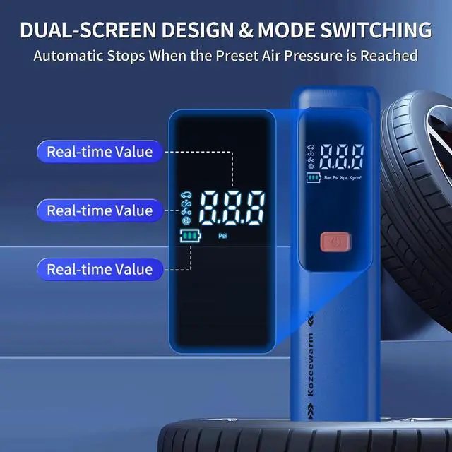 • EASY OPERATION & AUTO SHUT-OFF Equipped with 4 preset modes, this car air pump makes inflation effortless. The large digital display shows real-time tire pressure, and the auto shut-off function automatically stops inflating once the preset value is reached, preventing over-inflation and ensuring safety.