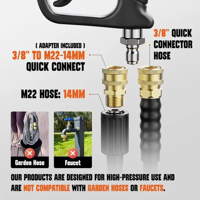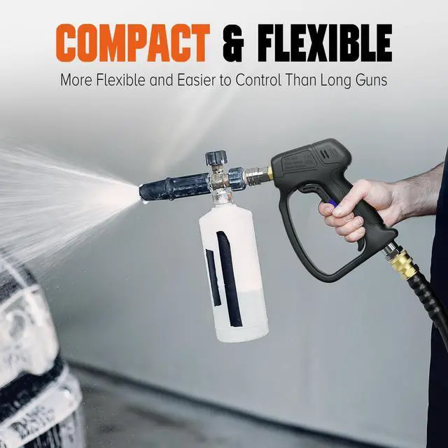 - Pistola Para Lavar Carros Interface Compatibility -- Car cleaning gun with a 1/4" female quick connector for foam cannons and nozzle tips. Pressure washer gun with 3/8" male quick connector and M22-14mm fitting is compatible with Generac, Simpson, Briggs & Stratton, Craftsman, Karcher, and Ryobi pressure washers.Please ensure you are using an M22-14mm hose before purchasing. If you have a 15mm hose, an additional adapter is required