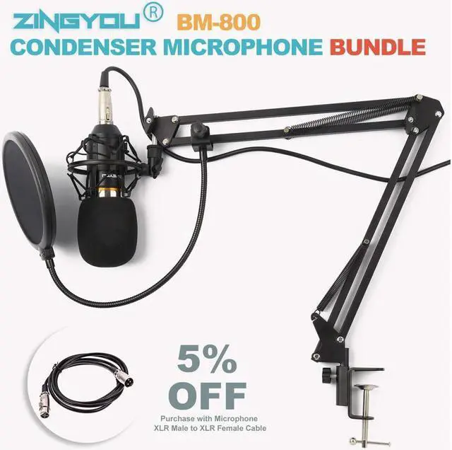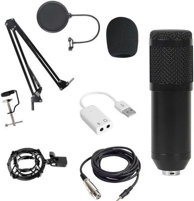 Package included: 1 x Condenser Microphone 1 x Microphone Cable 1 x Ball-type Anti-wind Foam Cap 1 x Metal Shock Mounts 1 x Adjustable Suspension Scissor Arm Stand 1 x Microphone Pop Filter 1 x USB Mini Sound Card 1 x English User