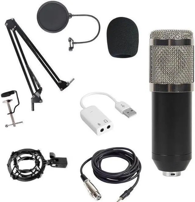 Package included: 1 x Condenser Microphone 1 x Microphone Cable 1 x Ball-type Anti-wind Foam Cap 1 x Metal Shock Mounts 1 x Adjustable Suspension Scissor Arm Stand 1 x Microphone Pop Filter 1 x USB Mini Sound Card 1 x English User