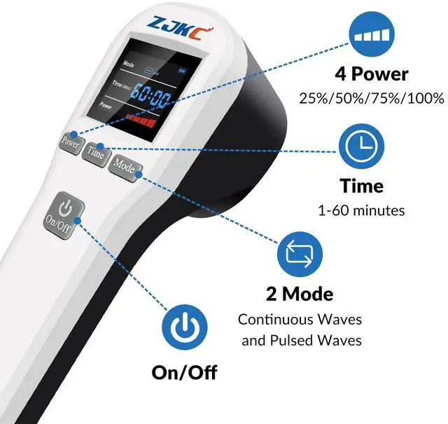 Multi-functions of the Infra Red Light Therapy DevicePower: 220/440/660/880mW four levels adjustable(Class 4/3b); Time: 1 to 60 minutes adjustable; Mode: CW-continuous wave and PW-pulsed wave at 10Hz adjustable ( There is evidence proven that PW is superior to CW for most application except nerve regeneration ). (Note: Long press On/Off of low laser therapy to turn on/off device, quick click On/Off of low level cold laser to work). cold laser for pain is recommended to use 1-2 times a day for 4-6 weeks, 20 minutes each time(according to your physical condition)