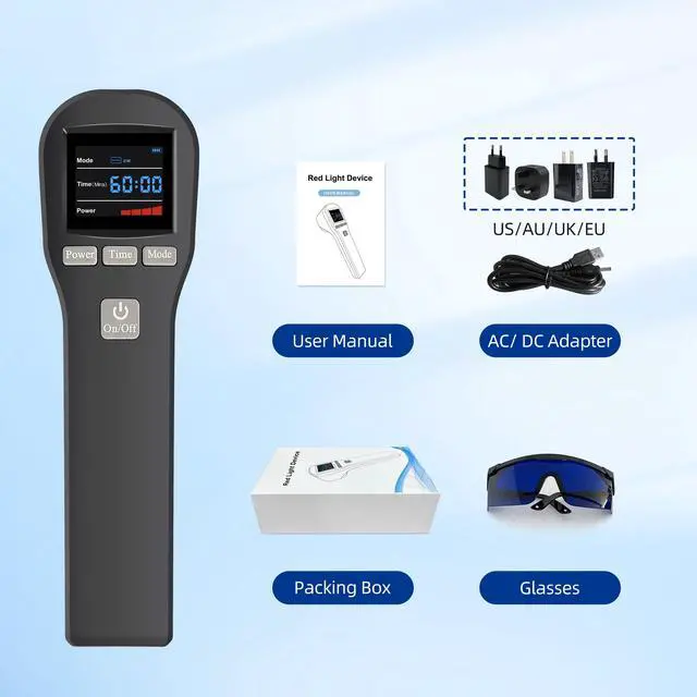 Package Details of Low Level Therapy This red light phototherapy includes 1 * lllt laser therapy device+ 1 * AC Adapter with Charge Cable + 1 * Eye Protection Glasses + 1 * User Manual + 1 * product box. More detail information, please see the product manual.If you have any questions about the red laser therapy device, please contact us. We are committed to providing you with satisfactory services.