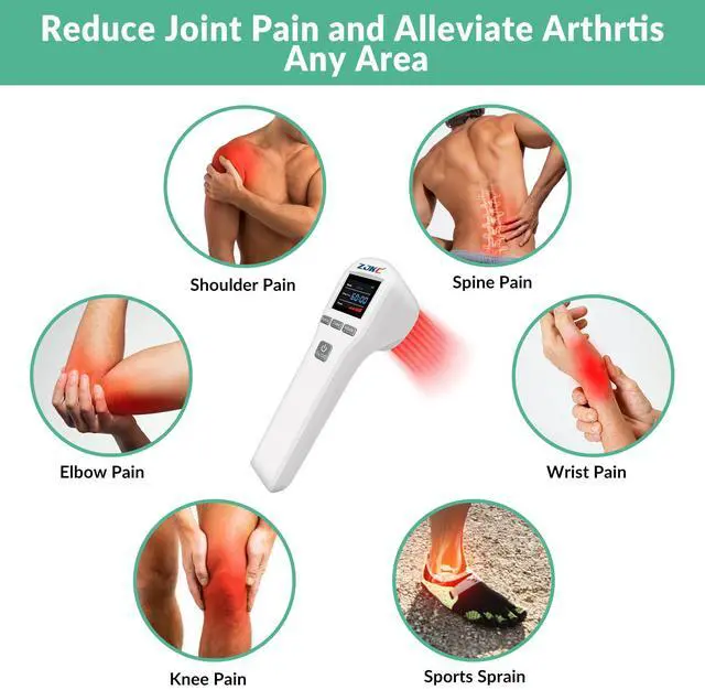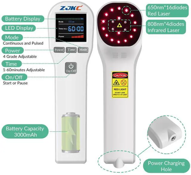 Therapy device has 2 wavelengths: 4x808nm +16X650nm; 650nm red light works on the surface of tissue, help with tissue repair, sports injuries recovery and pain relief. 808nm near infrared light come to the deep level which can improve blood circulation, relieve joint and muscle pain, relax muscle.