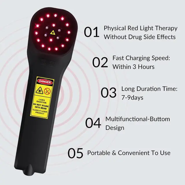 [Upgraded Light Therapy] Red light Therapy device has 2 wavelengths: 4x808nm +16x650nm; 650nm red light works on the surface of tissue, 850nm infrared therapy device come to the deep level, help with tissue repair, sports injuries recovery and pain relief. The near infrared light come to the deep level which can improve blood circulation, relieve joint and muscle pain, relax muscle. In the home infrared equipment, our pet cold laser therapy is a good choice