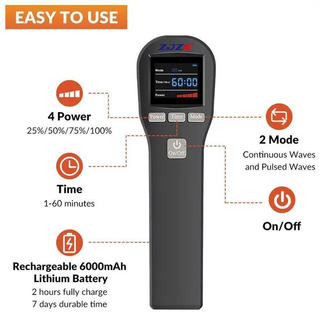 • Customizable treatment options include adjustable power levels, operational modes, and session durations, allowing users to tailor therapy to their specific needs.
