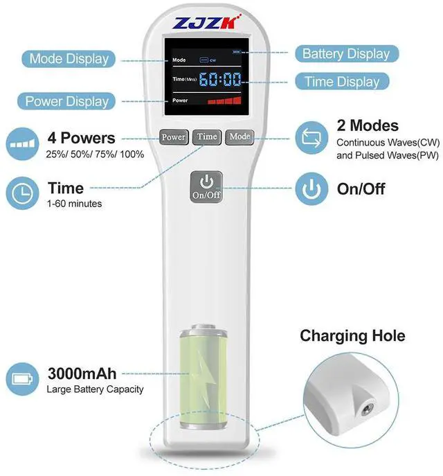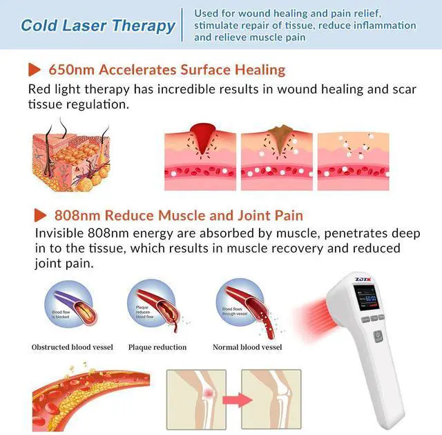 Dual wavelength tech: Utilize 650nm and 808nm in this laser device. 650nm boosts blood flow and eases surface pain, while 808nm targets deeper muscle and joint discomfort.
