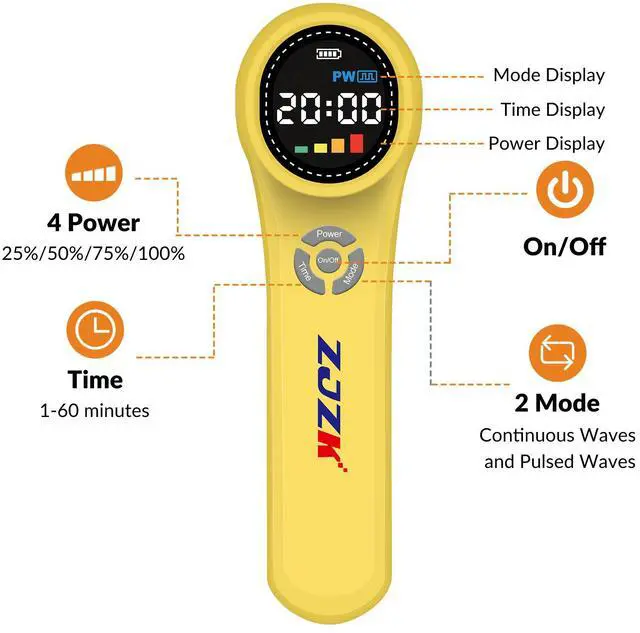 • Customizable Therapy: Adjust sessions with four power levels and a timer. Offers continuous and pulsed modes. Lightweight with up to 7 days of use per charge.