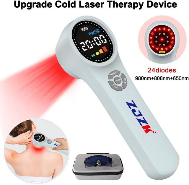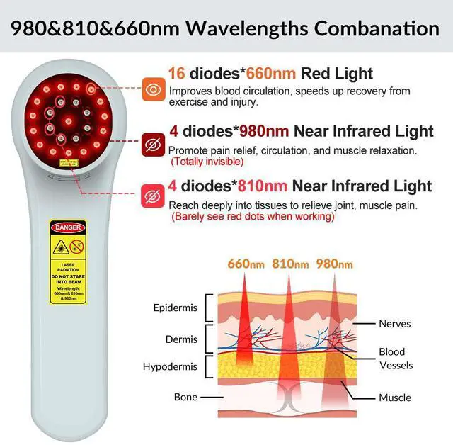 660nm Red Laser Light can improve blood circulation, 810nm Near-infrared Laser Light relieve pain from deep muscle and joint, and 980nm Near-infrared Laser Light can stimulate the dermal collagen growth while vasculartreatment, increase epidermal thickness and density.1760mW laser healing therapy devices, 24 diodes in total, 16diodes*660nm*10mW, 4diodes*810nm*200mW and 4diodes*980nm*200mW, painless and sterile treatment, let you say goodbye to pain and protect your health.