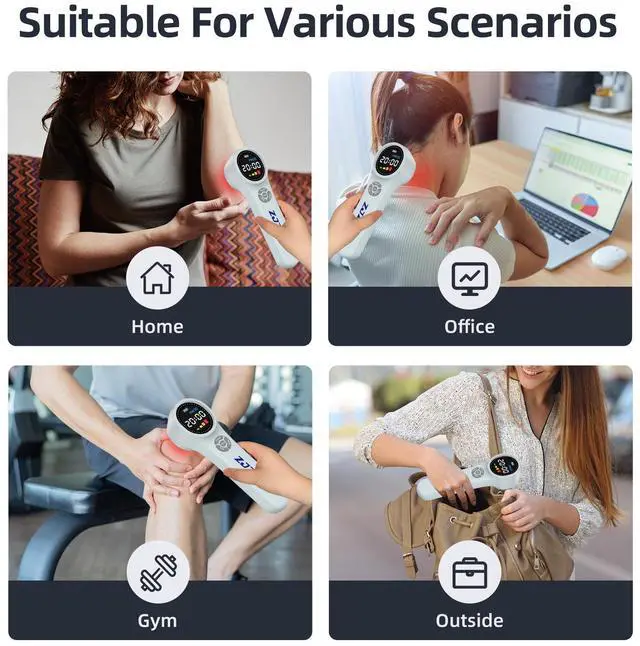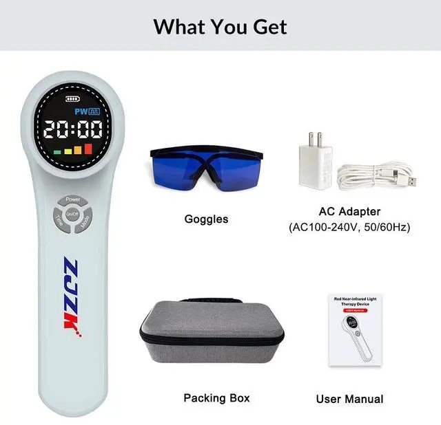 The laser for pain and inflammation device is better close to the skin to 2-3cm use, 20 minutes 1-2 times a day for 4 weeks to relieve from a sprain or a serious fall. You will benefit from consistent use. And Our laser therapy for muscle injury device includes 1*Therapy device, 1*Goggles, 1*Charger, 1*Packing box, and 1*User manual. Also we provides one year warranty from the date of purchase. At home laser treatment is safe, painless and has no side effects, a great gift for your family or friend.