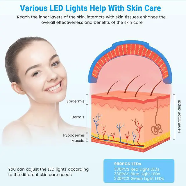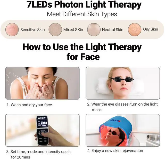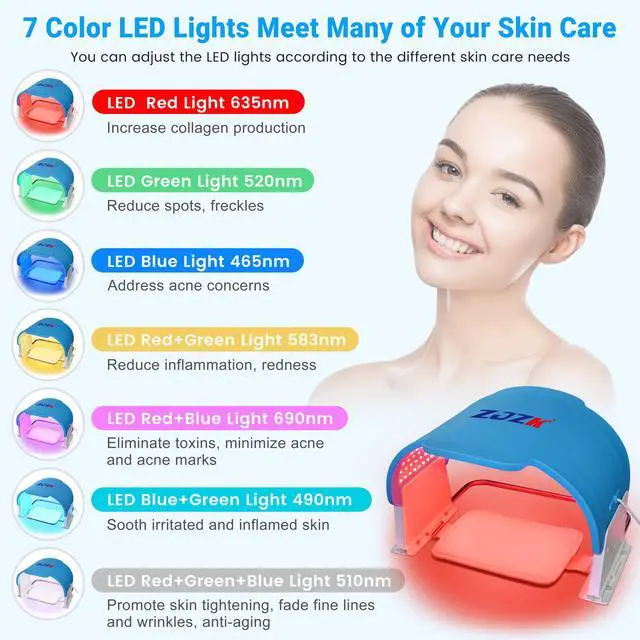 Experience advanced skincare with the ZJZK Medical Grade 7-Color LED Face Mask PDT. Engineered with 990 high-intensity LED beads330 each of red, blue, and greenthis device offers seven targeted light therapies (red, blue, green, yellow, purple, cyan, and white) to address a range of skin concerns. Easily select your preferred wavelength or cycle through eight light modes to suit your skincare needs.