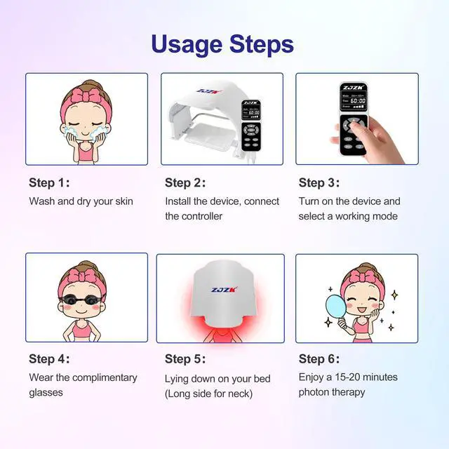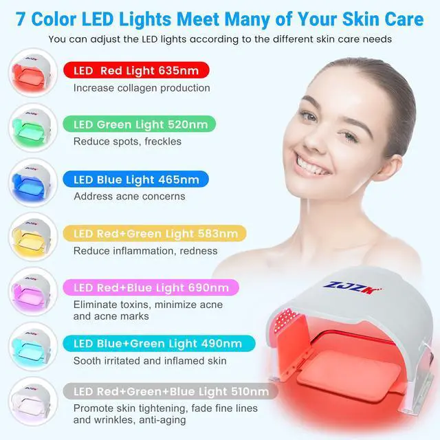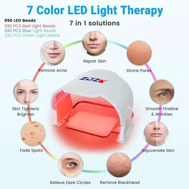 Experience advanced skincare with the ZJZK Medical Grade 7-Color LED Face Mask PDT. Engineered with 990 high-intensity LED beads330 each of red, blue, and greenthis device offers seven targeted light therapies (red, blue, green, yellow, purple, cyan, and white) to address a range of skin concerns. Easily select your preferred wavelength or cycle through eight light modes to suit your skincare needs.