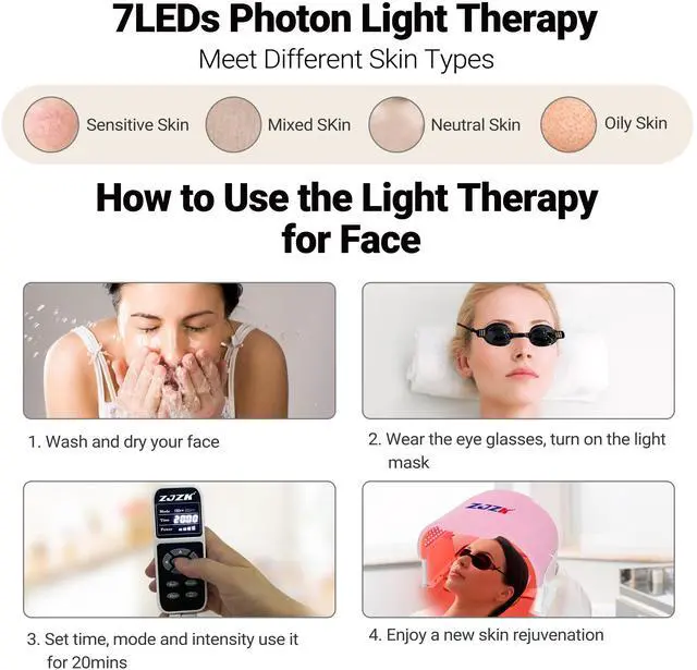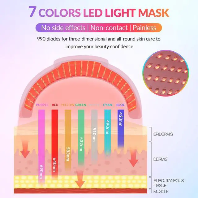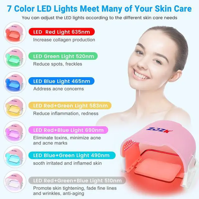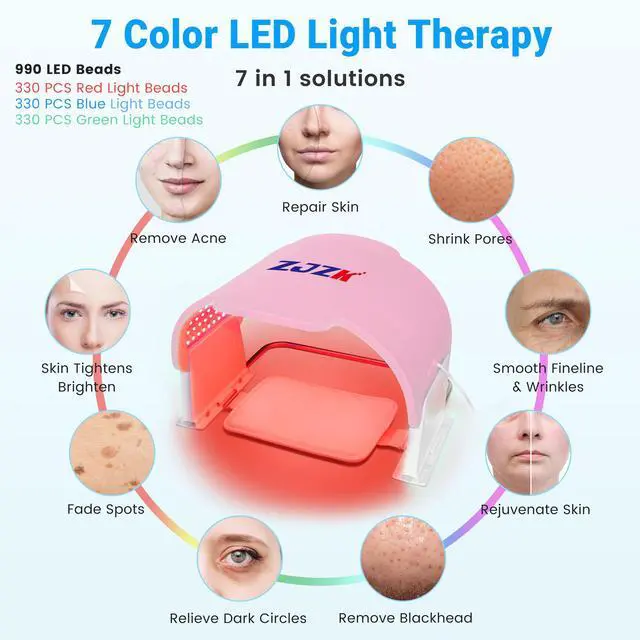 Experience advanced skincare with the ZJZK Medical Grade 7-Color LED Face Mask PDT. Engineered with 990 high-intensity LED beads330 each of red, blue, and greenthis device offers seven targeted light therapies (red, blue, green, yellow, purple, cyan, and white) to address a range of skin concerns. Easily select your preferred wavelength or cycle through eight light modes to suit your skincare needs.