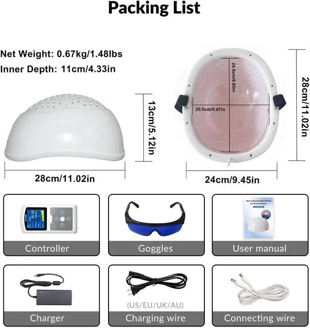 Safe, convenient and high cost effectiveNo side effect, Non-invasive, no cross infection, no surgical, drug-free. The package includes 1* helmet, 1*Controller, 1*Goggles, 1*Charger, and 1*User manual, Charing wire*1, Connecting wire*1. lso we provides one year warranty from the date of purchase.