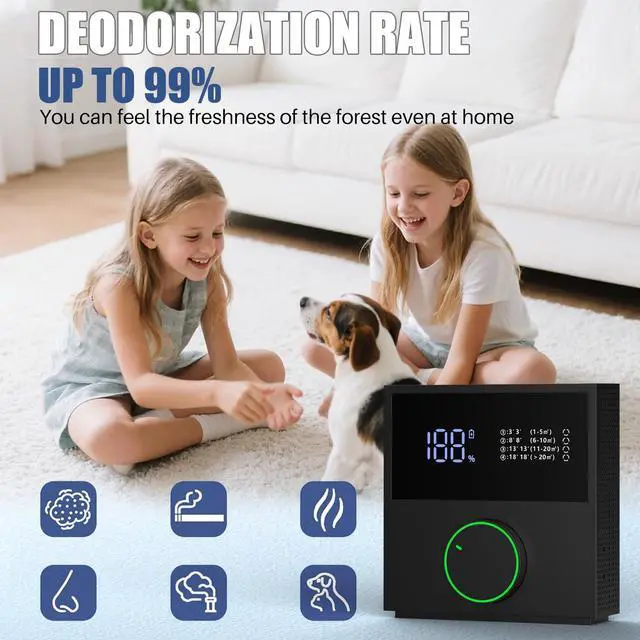 A: The active oxygen technology (150mg/h output) neutralizes stubborn odors such as pet smells, bathroom odors, and formaldehyde residues within minutes, ensuring fresher air rapidly.