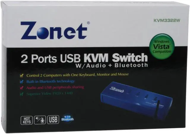 | Features | Control 2 Computers with one Keyboard, Monitor and Mouse Built-in Bluetooth technology Share Audio and USB peripherals Superior video quality of 1920 x 1440 resolution Bluetooth Standard: V1.2 Working Distance : Max. 10M in Free space Sensitivity: <-89dBm at < 0.1% BER Profile supported: Virtual Serial Port, Dial-up Networking, Fax, Headset, File Transfer, Information Exchange, Information Synchronization, and Network Access, Audio Gateway, HID |