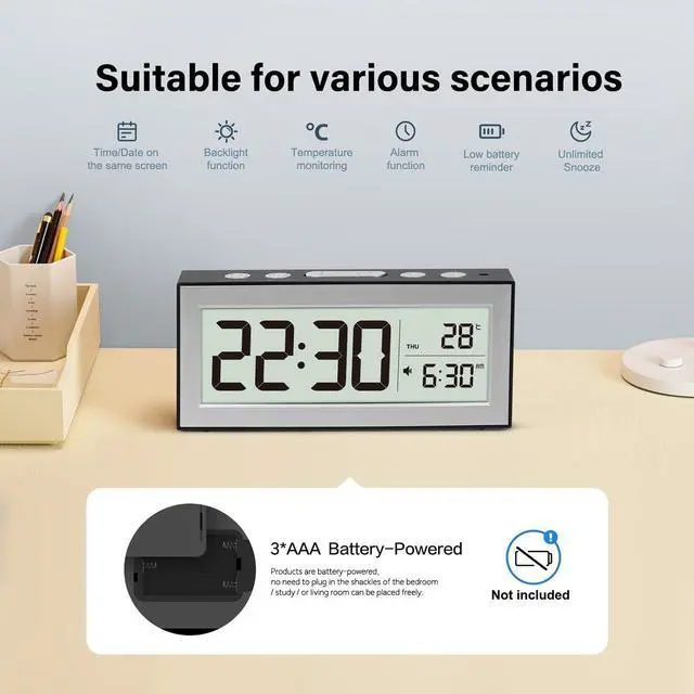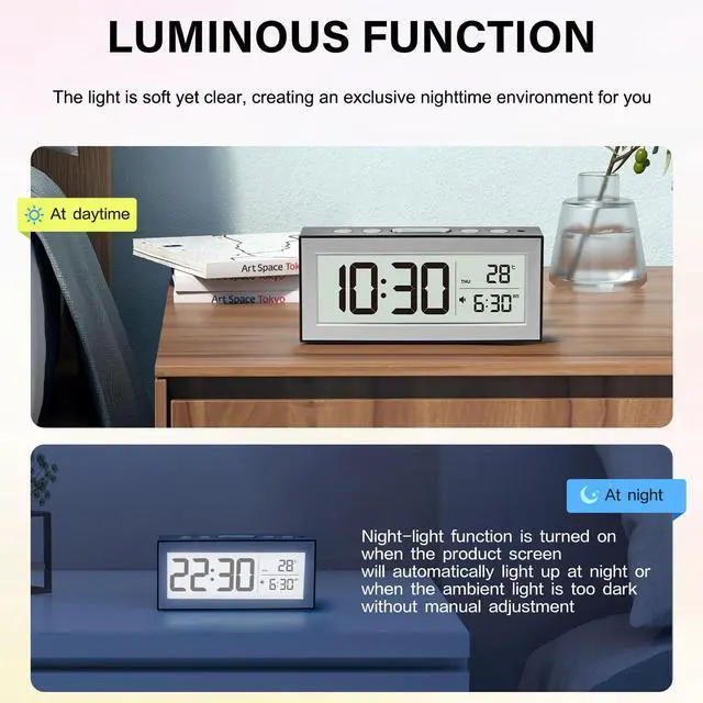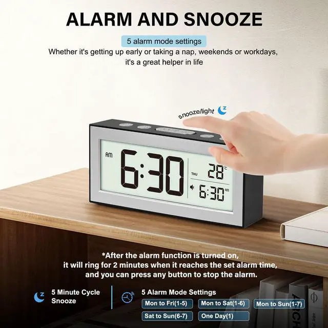Snooze Function & Backlight for Gentle Wake-UpsWake up naturally with the built-in snooze function and gentle backlight. When the alarm sounds, a quick press puts it into snooze mode, accompanied by a soft backlight that lasts for 5 minutes, giving you a peaceful transition to your day. Reactivate the backlight anytime by pressing the button, perfect for checking the time without disturbing the room's ambiance