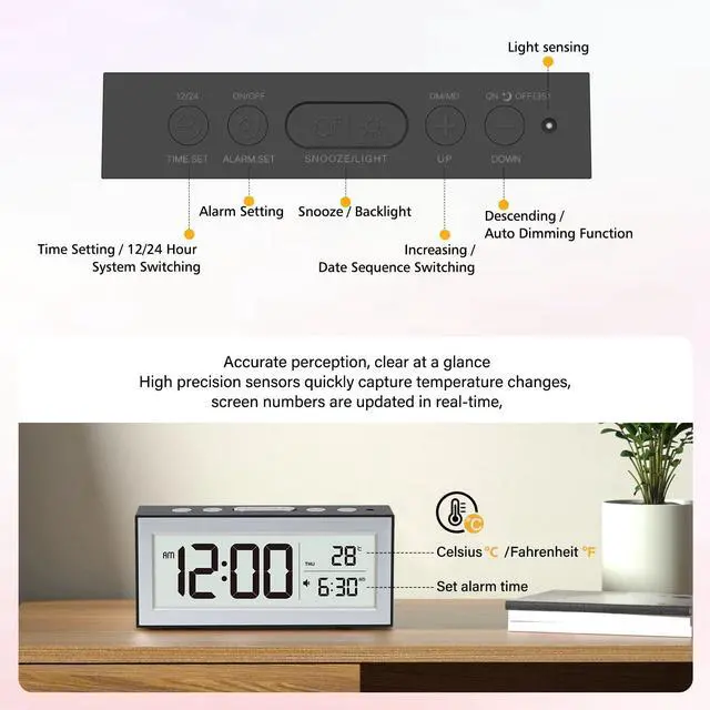 Effortless Time & Date Adjustment with Automatic DimmingSetting the perfect time and date is a breeze with Zonopy. Easily toggle between 12/24-hour formats and swiftly adjust settings using the intuitive +/- buttons. Plus, enjoy the convenience of automatic dimming that adjusts screen brightness based on ambient light, optimizing visibility while conserving battery life