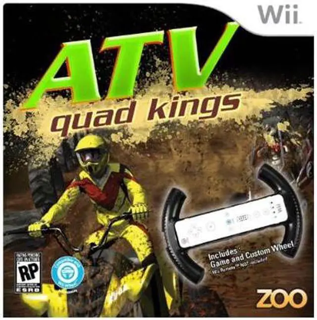 | Features | ATV Quad Kings immerses the player in the world of ARV motocross racing where aggressive driving and hard-hitting skills are needed to become the King of ATVs. Travel across the globe from the United States to Australia and race in nine breathtaking locations. Compete in incredible high-adrenaline races at each track...but that's not all! Perform tricks and catch big air in freestyle events to increase your skill rating. There's no where to hide! It's fast and furious four-wheel racing on Wii™! Features Four championship levels from Amateur to All Star gets everyone in the game. Four game modes: World Tour, Arcade, Time Trial, and Freestyle. Many quad bikes and dune buggy vehicles to choose from, each with varying suspension, acceleration, speed, handling, and braking attributes. Earn money from races to customize your vehicles in your virtual garage. Race head-to-head in two player Arcade and Freestyle events Win the five World Tour trophies including the ultimate ATV Quad Kings Trophy to be #1. Master the Freestyle stunt events to unlock tracks in the Arcade game mode. Contend with different road surfaces such as soil, grass, and water - and watch out for the occasional rain shower to change the track conditions. Play with your Wii Wheel™ for additional fun. |