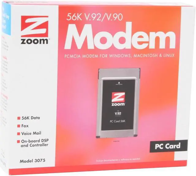 | Features | Faster Web Browsing with V.44 Faster Connect Times with V.92 QuickConnect Maximum Compatibility On-board DSP and Controller for improved performance PC Card Guard for protection against digital PBX over-voltage ZoomGuard Advanced Lightning Protection Voice Mail Support Documentation and software provided in English and Spanish On-board controller V.80 for point-to-point video over standard phone lines Call progress tone detection (dial tones, busy, ring, etc.) Slim phone cord (connects PC Card to standard RJ-11 phone jack) Plug and Play for automatic configuration with Windows |