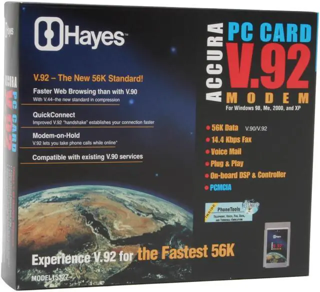 | Features | Your office is where you rest your laptop computer. Portability and reliability are necessary qualities in your office equipment. Hayes credit card sized, controller-based PC Card modem with onboard DSP offers the ultimate in portability and reliability for laptop computer users. |