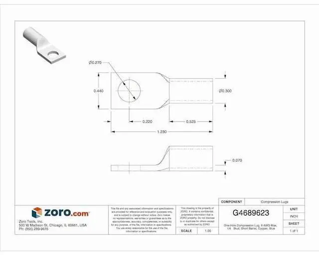 California Proposition 65: This product contains a chemical known to the State of California to cause birth defects or other reproductive harm. One-Hole Lug Compression Connector, Barrel Size Short, Color Code Blue, Die Code 24, Tongue Angle Straight, Tongue Width 0.44 in, For Conductor Material Copper, For Stud Size 1/4 in, For Stranded Copper Wire Size - Minimum 6 AWG, For Stranded Copper Wire Size - Maximum 6 AWG, Inspection Hole Yes, Material Copper, Maximum Operating Temperature 300 Degrees F, Maximum Voltage 600 V AC, Termination Style Crimp, Seam Style Seamless, Standards UL Listed, Number of Holes 1, RoHS Compliant Yes. This item has been restricted from sale in the following state (s): []