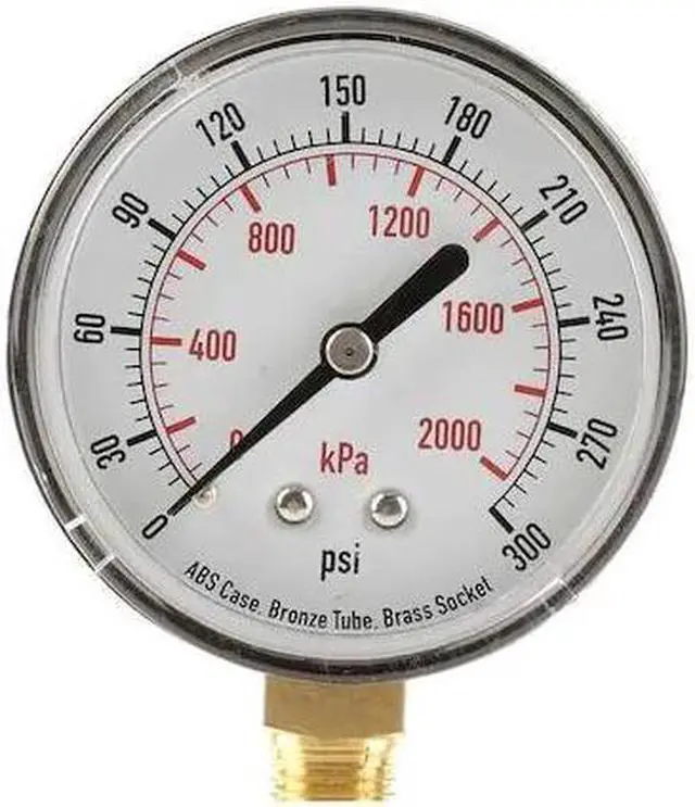 California Proposition 65: This product contains a chemical known to the State of California to cause birth defects or other reproductive harm. Commercial Pressure Gauge, Accuracy +/-3-2-3 Percent, Gauge Case Material ABS Plastic, Nominal Dial Size 2 1/2 in, Lens Material Acrylic, IP/NEMA Rating Not Rated, Hazardous Location Rating Not Rated, Sensor Material Bronze, Socket Material Brass, Process Connection Type NPT, Process Connection Gender Male, Process Connection Location Bottom, Process Connection Size 1/4 in, Panel-Mountable No, Pressure Gauge Type General Purpose Dial Pressure Gauge