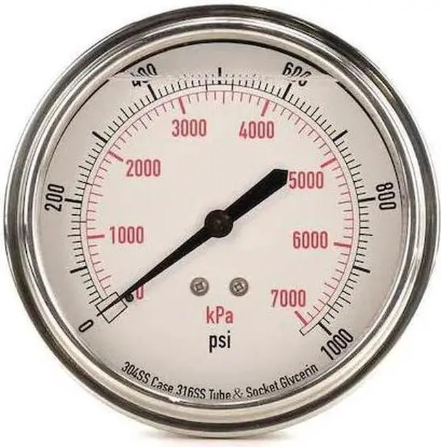 California Proposition 65: This product contains a chemical known to the State of California to cause birth defects or other reproductive harm. Commercial Pressure Gauge, Nominal Dial Size 3 1/2 in, Accuracy +/-3-2-3 Percent, Gauge Case Material 304 Stainless Steel, Process Connection Type NPT, Process Connection Gender Male, Lens Material Acrylic, Process Connection Size 1/4 in, Field Fillable No, Process Connection Location Center Back, Case Color Silver, IP/NEMA Rating Not Rated, Primary Pressure Range 0 to 1, 000, Dry Dampening Feature None, Vibration Resistance Liquid-Filled, Dial Color White. This item has been restricted from sale in the following state (s): []