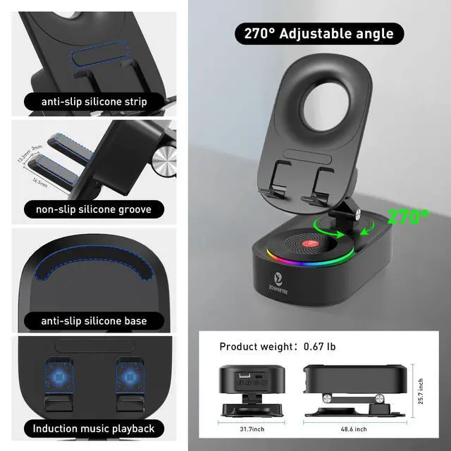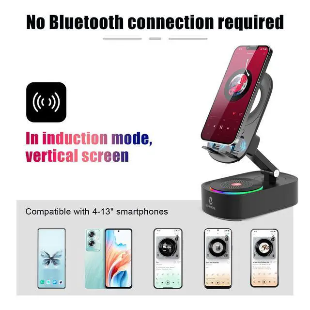 5in1 Wireless Induction Audio Bluetooth Speaker with Phone Stand, Work Time 8H+, Colorful Ambient Light, Emergency Rechargeable, 270° Foldable Suitable for iPhone Android Phone Tablet, a Nice Gift