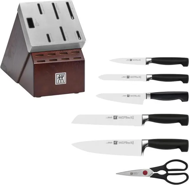 Keep it sharp with this 7-piece self-sharpening knife block set that features an essential set of razor-sharp knives for everyday cutting. Peel fruits and vegetables and create garnishes with the 3-inch paring knife, cleanly slice foods with a hard exterior and soft interior with the 5-inch serrated utility, and chop herbs, dice onions, and mince garlic with the 8-inch chefs knife.